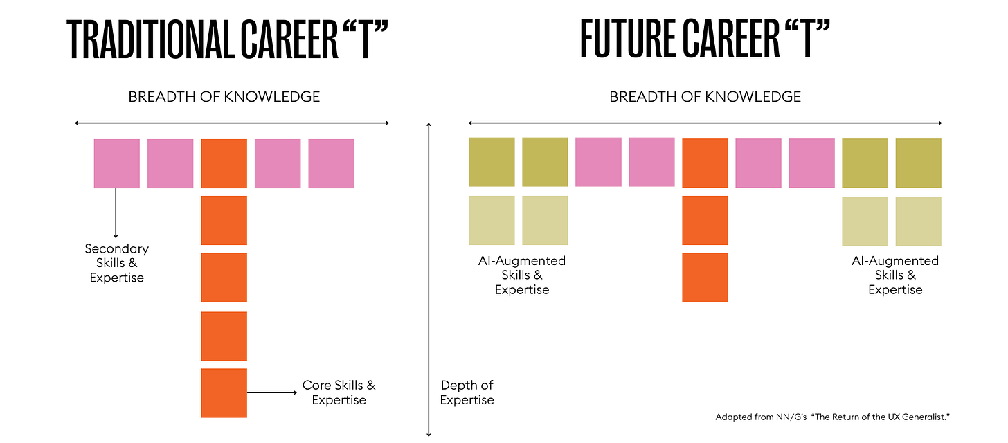 It might be an easy assumption that this “expanded-T” trajectory will further isolate disciplines or lead to an extinction event, wiping out entire specialisms.4 If everyone can do everything on their own—or rather, with an LLM or team of skills (the Claude kind), or agents in tow—then why have all these specialisms, and why work together?