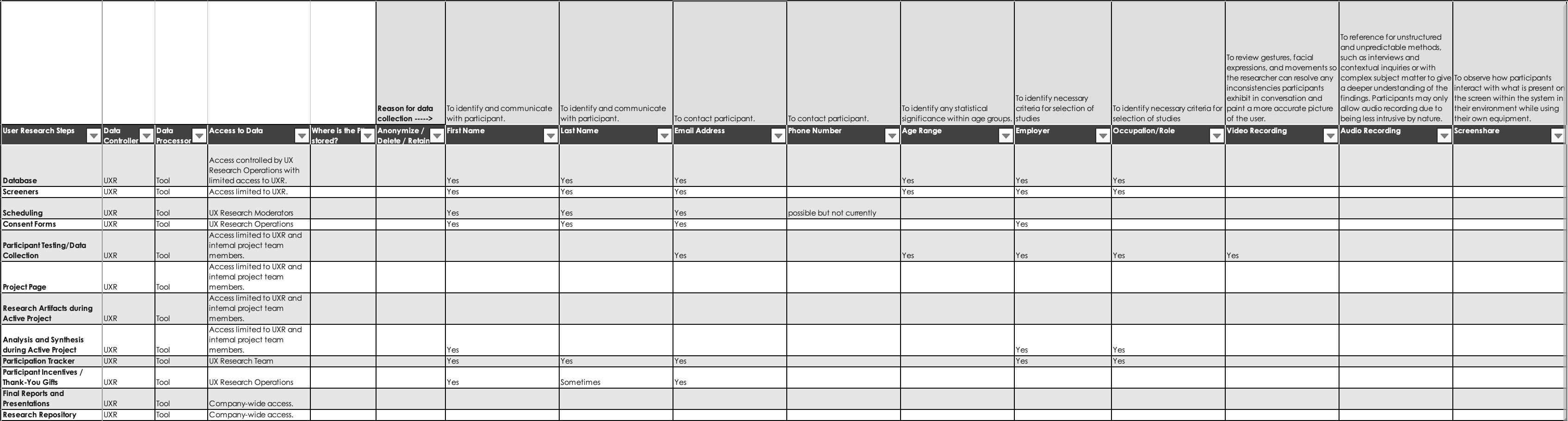 If you want to collect any data at all, you should be able to provide a reasonable explanation why the information is necessary to the research and how it will be used. If someone requests additional data simply “because it may be good to have in the future,” say no. Document the types of PII and related reasons for collecting these in Columns E-F, Rows 1-2 in the ResearchOps PII Collection and Storage Template to gather, for example: