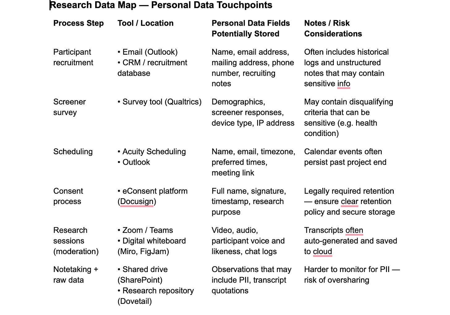 Does personal data exist in tools? Do you have personal data in your email? What about research databases, local drives, screeners, scheduling, consent forms, project pages, analysis and synthesis, participation, and incentive trackers?