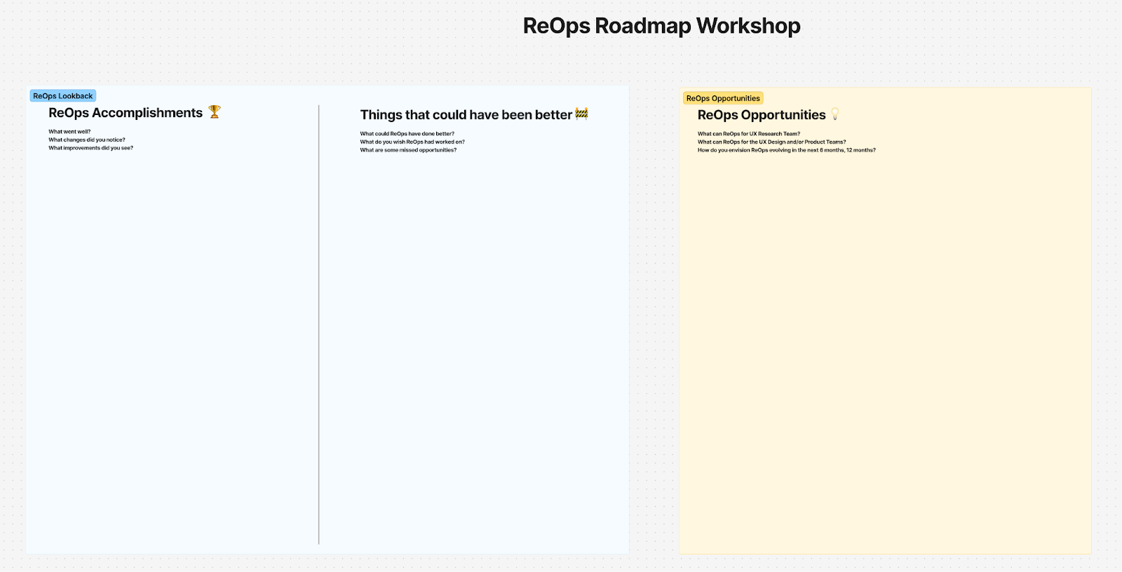 When I started planning the workshop activities, I had one goal in mind: keep it simple. I wanted to create a safe space where attendees could share both big and small ideas about what I could work on in the upcoming months while reflecting on the accomplishments and missed opportunities of the past few months. With that in mind, I developed a framework for a one-hour ResearchOps Roadmap Workshop. I now run this workshop twice a year—once in early January and again in early July—to align with other teams’ planning cycles and ensure ResearchOps stays front and center when it comes to broader strategic conversations. Running it regularly also helps keep me in sync with company-wide planning, while clearly documenting ResearchOps’ achievements and what’s ahead in the coming months, and even year. For example, I recently worked on an initiative to identify a new survey tool that could better support the evolving needs of our growing quantitative practice—something that required dedicated time for evaluation, stakeholder alignment, and a smooth transition plan. This sort of work would’ve been challenging to prioritize without a clear roadmap.