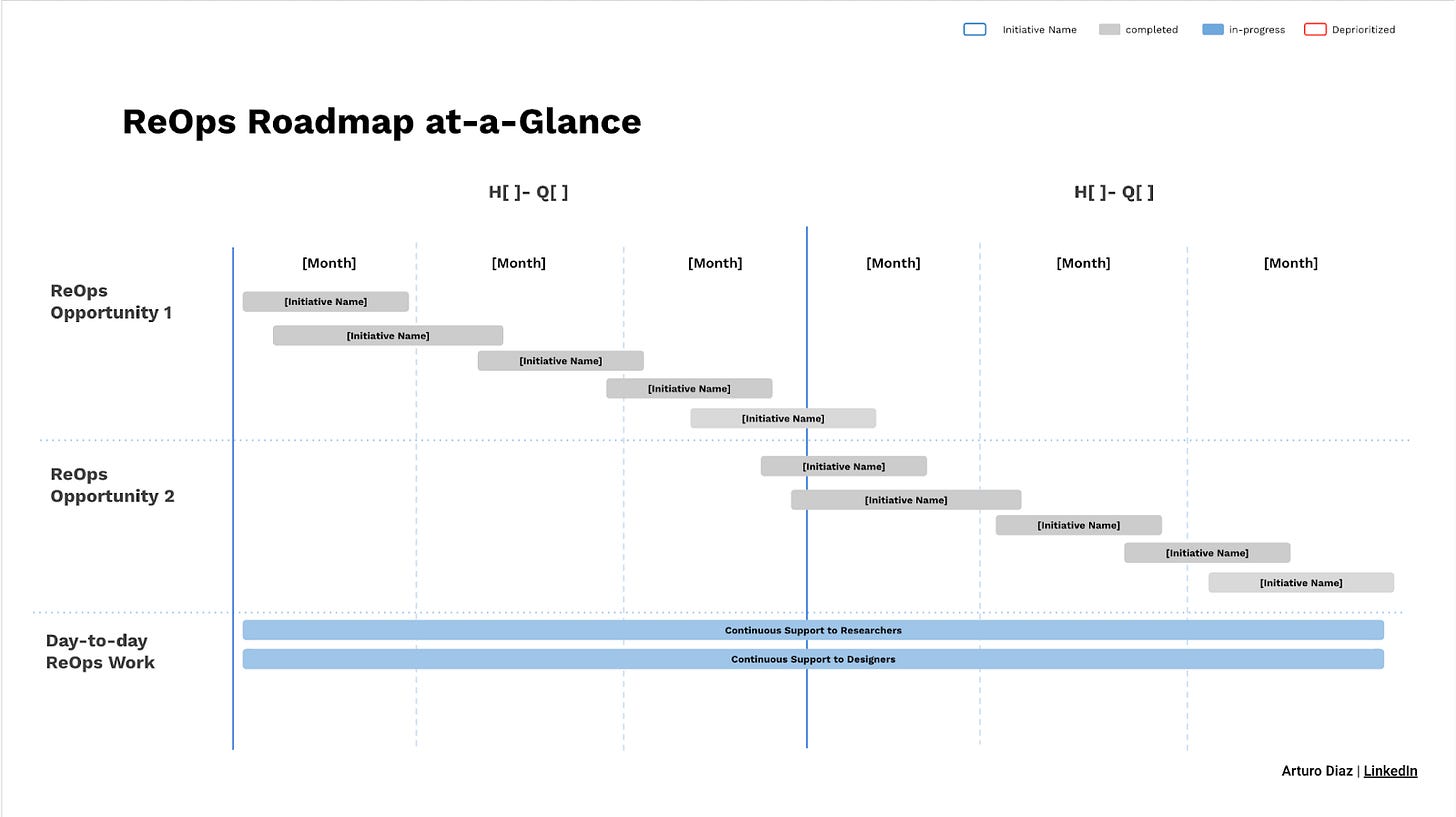 There’s a clear before and after when it comes to implementing ResearchOps roadmaps—they’ve transformed how I manage my time, align with teams, and demonstrate the true impact of Research Operations. What used to feel like a never-ending list of scattered tasks now has structure, direction, and visibility. Roadmap planning helps manage workload, enhance visibility, and set timelines for strategic initiatives, while also creating space for the unpredictable yet persistent fires! that inevitably arise. On that note, I typically allocate around 20 percent of my time to reactive needs, creating a buffer that helps me strike a balance between responsiveness and long-term focus.