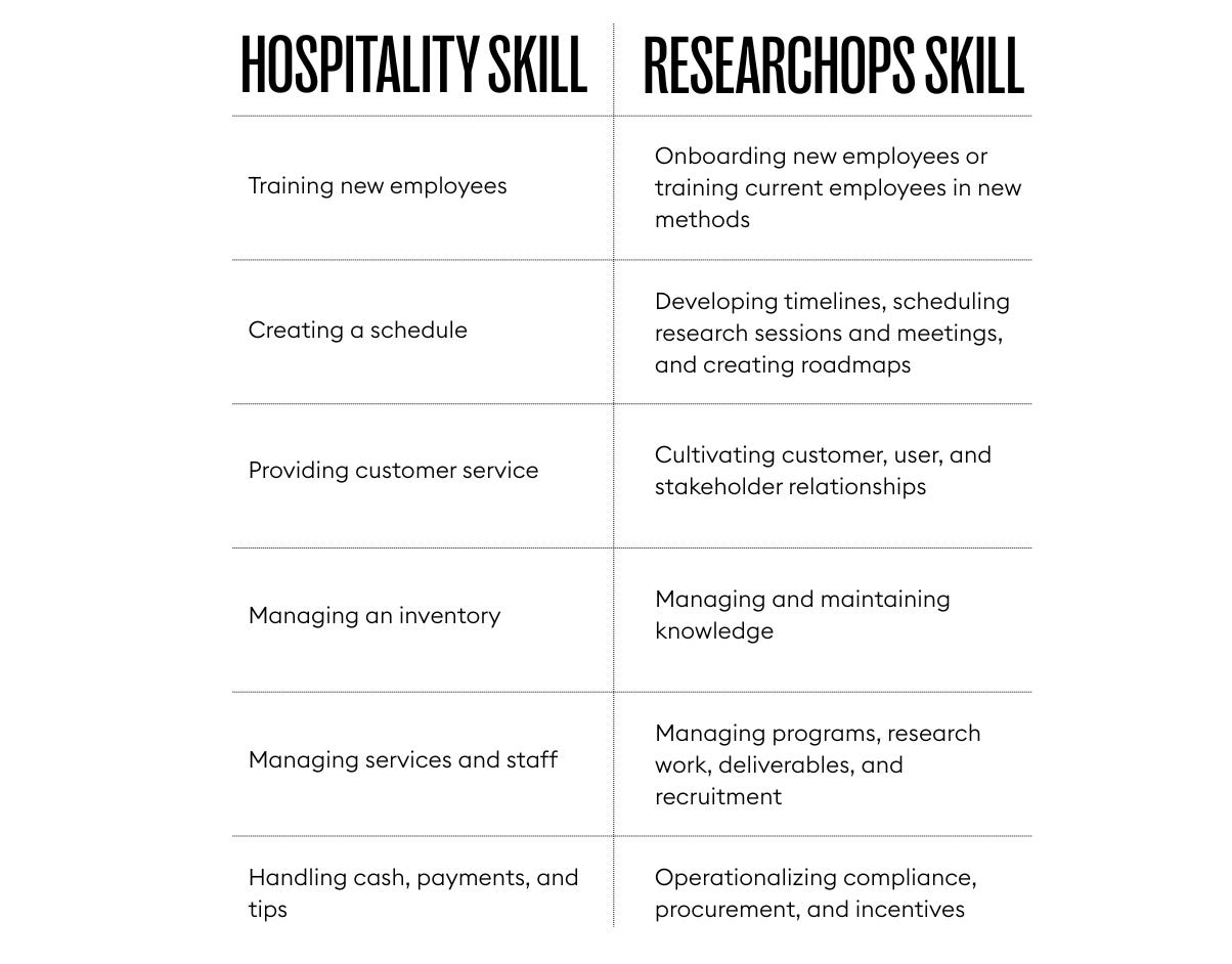 If, like me, you’d like to make a change from a career in hospitality, whether in a restaurant, hotel, hostel, kitchen, retail store, or at a front desk, while still doing what you love, this article is for you. I’ll explain how the things you love about working in hospitality can translate to a meaningful career in ResearchOps. And if you’re a ResearchOps professional who’s hiring, I’ll prove that the hospitality industry is full of talented folks with the ideal attitudes and skill sets to thrive in your team.