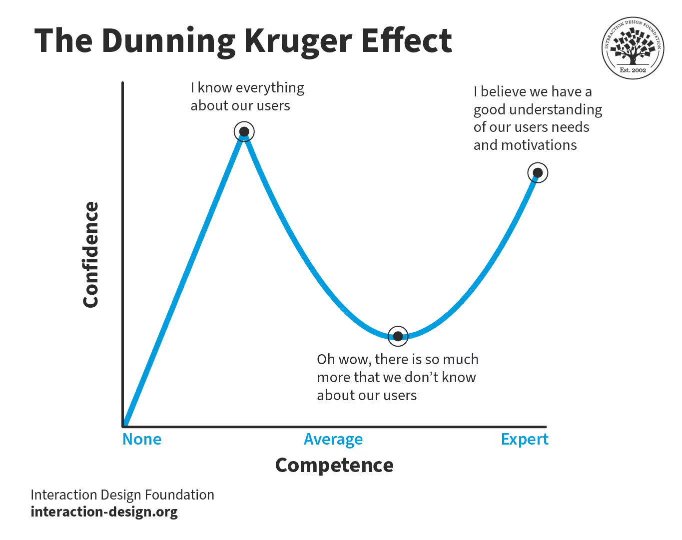 As a people leader in research operations, I worry about the effects of research democratization on the mental well-being of the teams and individuals I support. I worry that my teams will be left behind in democratization—that they, as researchers, are no longer understood to be experts in their field and are left out of conversations where they could help product and design navigate risky decisions. I worry that by teaching and encouraging our partners to do low-risk research, our partners might make camp on top of Dunning-Kruger’s Mt. Stupid (“I know everything about users”), while researchers will wallow in an extended and ever-deepening valley of despair.