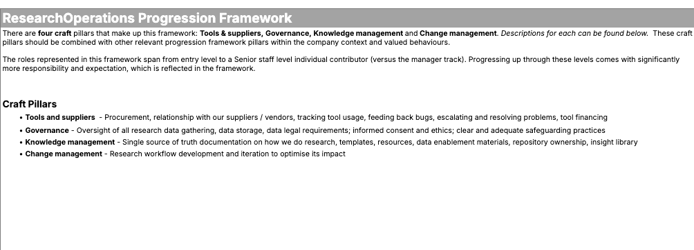 Luckily, when we started this endeavour, we didn’t have to work with an entirely blank canvas. We already had an overarching architecture that defined scope and impact for each job level across the company, and we looked at the researchers’ progression framework as a reference point (as ResearchOps was a specialism within the research team). But for the ResearchOps-specific framework to be meaningful, it was important to explicitly call out several craft pillars that are unique to the craft of ResearchOps.