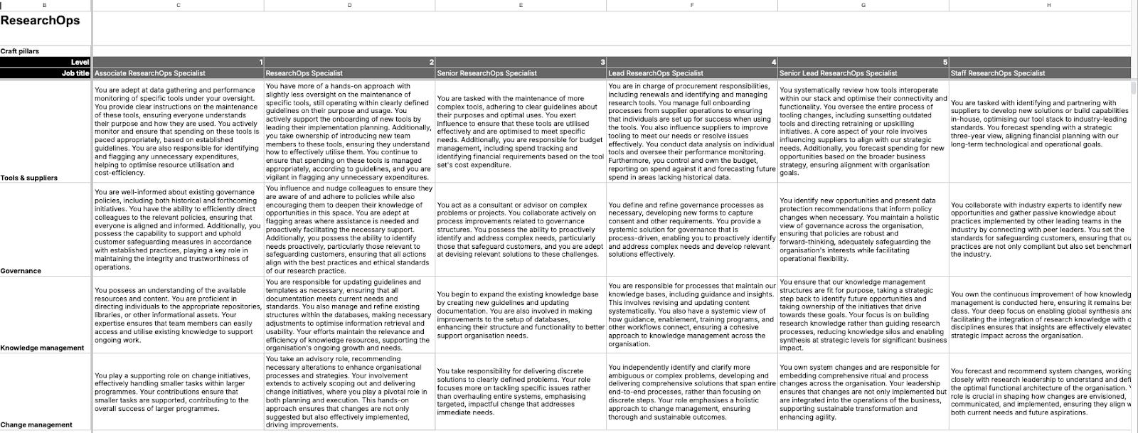 In working out what the craft pillars were and how they scaled across different levels, my director and I were able to tightly align on and outline the remit and scope of the ResearchOps function as a whole. For example, we could demonstrate in very practical terms how a more experienced ResearchOps person would approach tooling (looking at the whole system and how the tool stack interoperates with a view to transforming ways of working), versus the approach of someone in a more junior station (overseeing usage of a standalone tool to find improvements and optimisation).