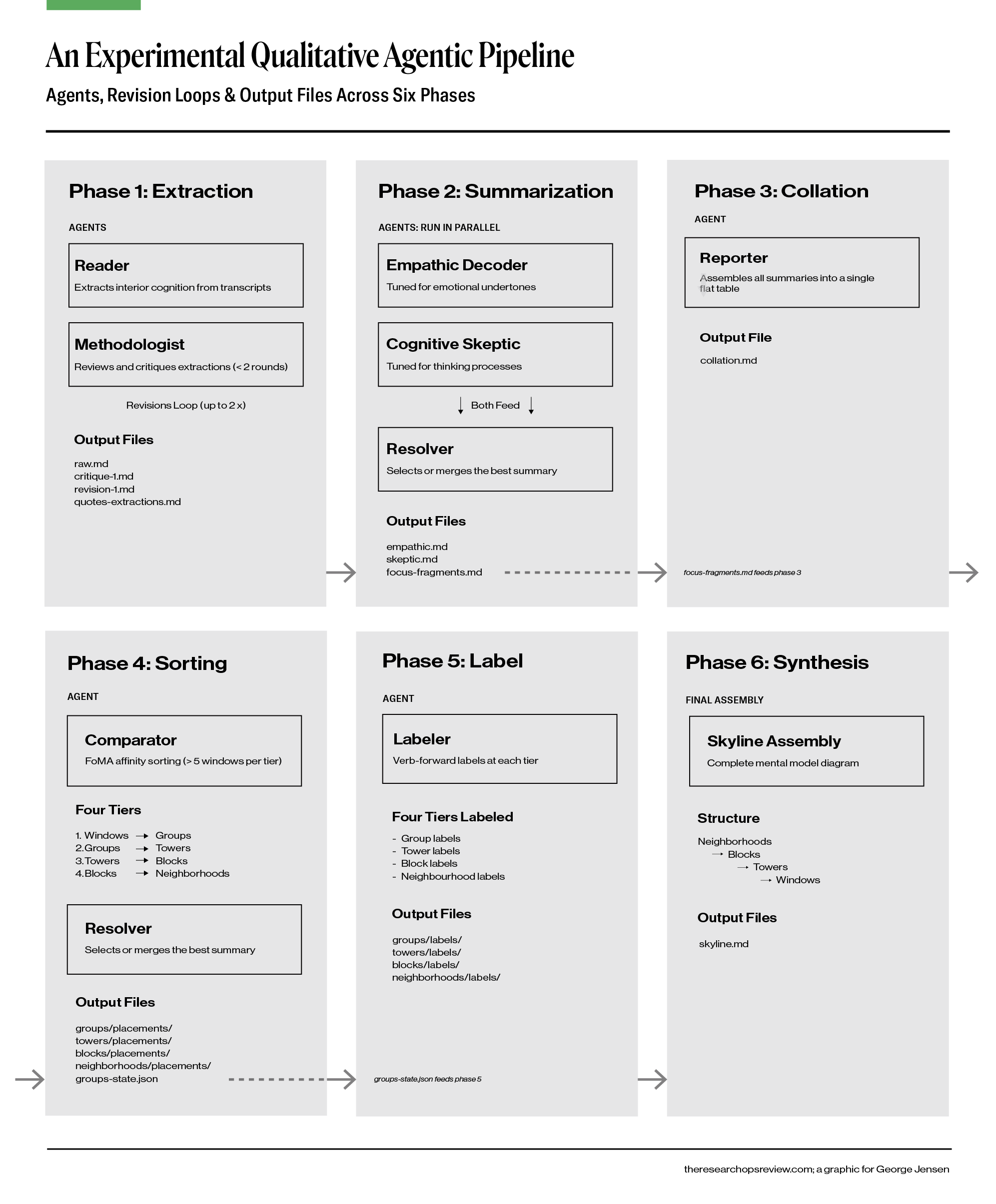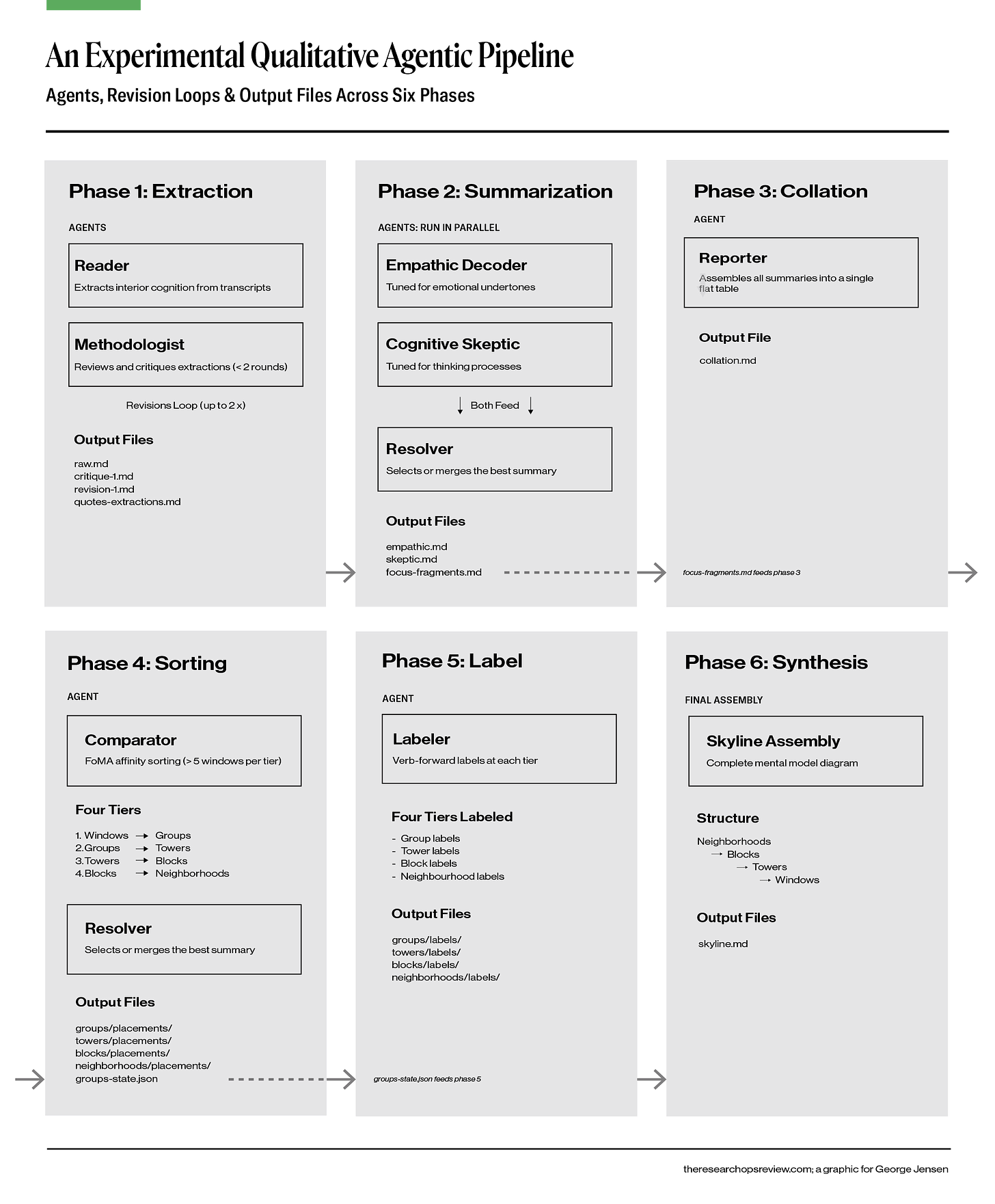 On a practical note, agentic ResearchOps revolves around using natural language to write specific analytical skills (step-by-step cognitive descriptions and rules that tell the model exactly how to parse subjective data), which are stored in centralized markdown (.md) files. These files act as strict, governed boundaries that configure the enterprise’s multi-agent workflows. Knowing how to tune these agents or skills might not be overtly technical, but it does require a deep methodological grounding, such as encoding Young’s DStL criteria for “emergent patterns.”